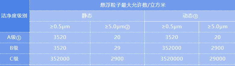 ⑦生產(chǎn)操作全部結(jié)束、操作人員撤出生產(chǎn)現(xiàn)場(chǎng)并經(jīng)15~20分鐘(指導(dǎo)值)自?xún)艉?,潔凈區(qū)的懸浮粒子應(yīng)當(dāng)達(dá)到表中的“靜態(tài)”標(biāo)準(zhǔn)。