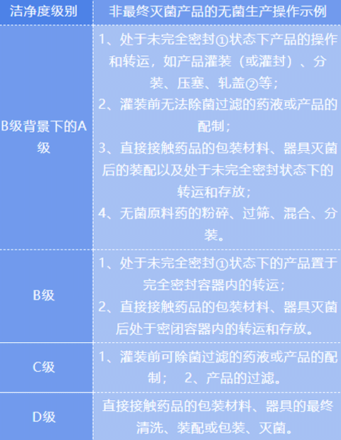 C級(jí)和D級(jí):指無(wú)菌藥品生產(chǎn)過(guò)程中重要程度較低操作步驟的潔凈區(qū)。