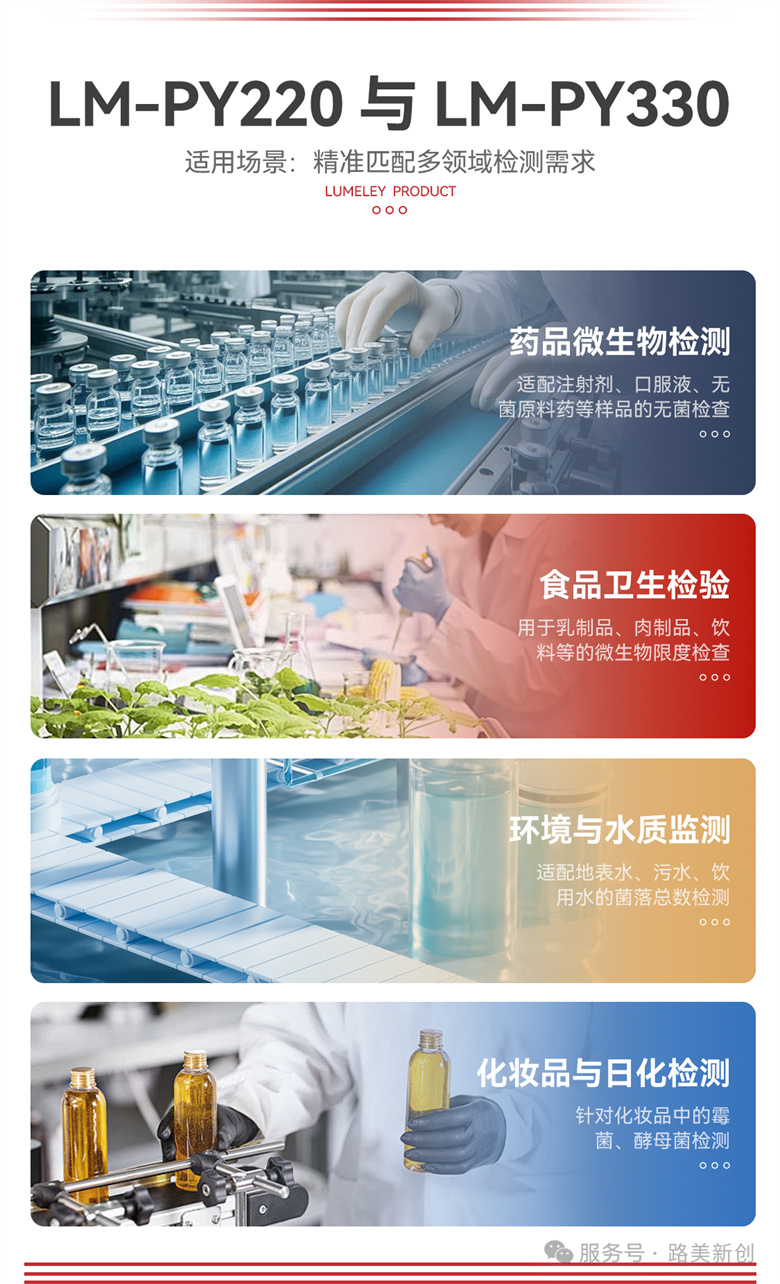 LM-PY220 與 LM-PY330 雖核心技術一致,但適配不同檢驗量需求,能覆蓋藥品、食品、環(huán)境三大核心檢測領域: